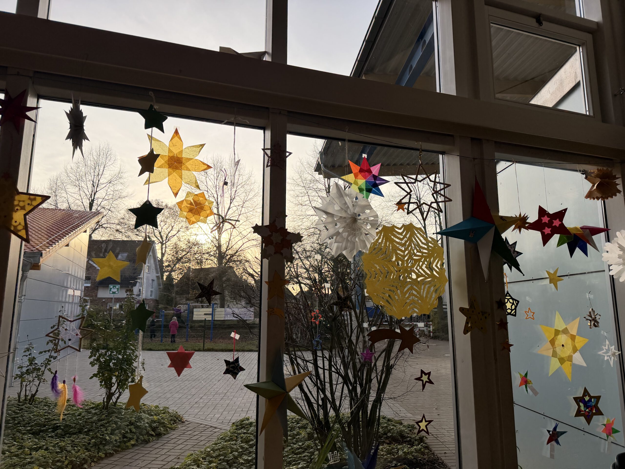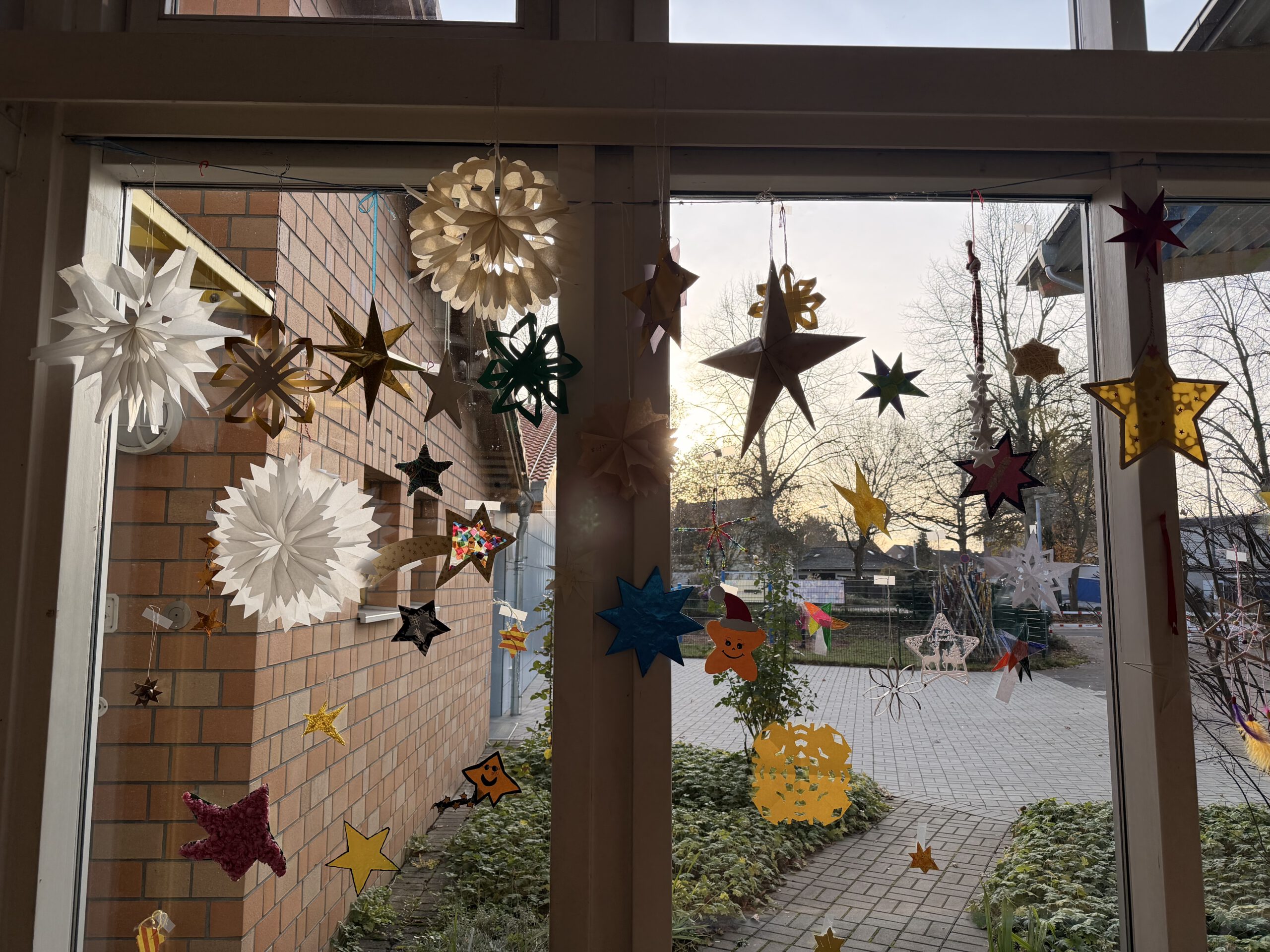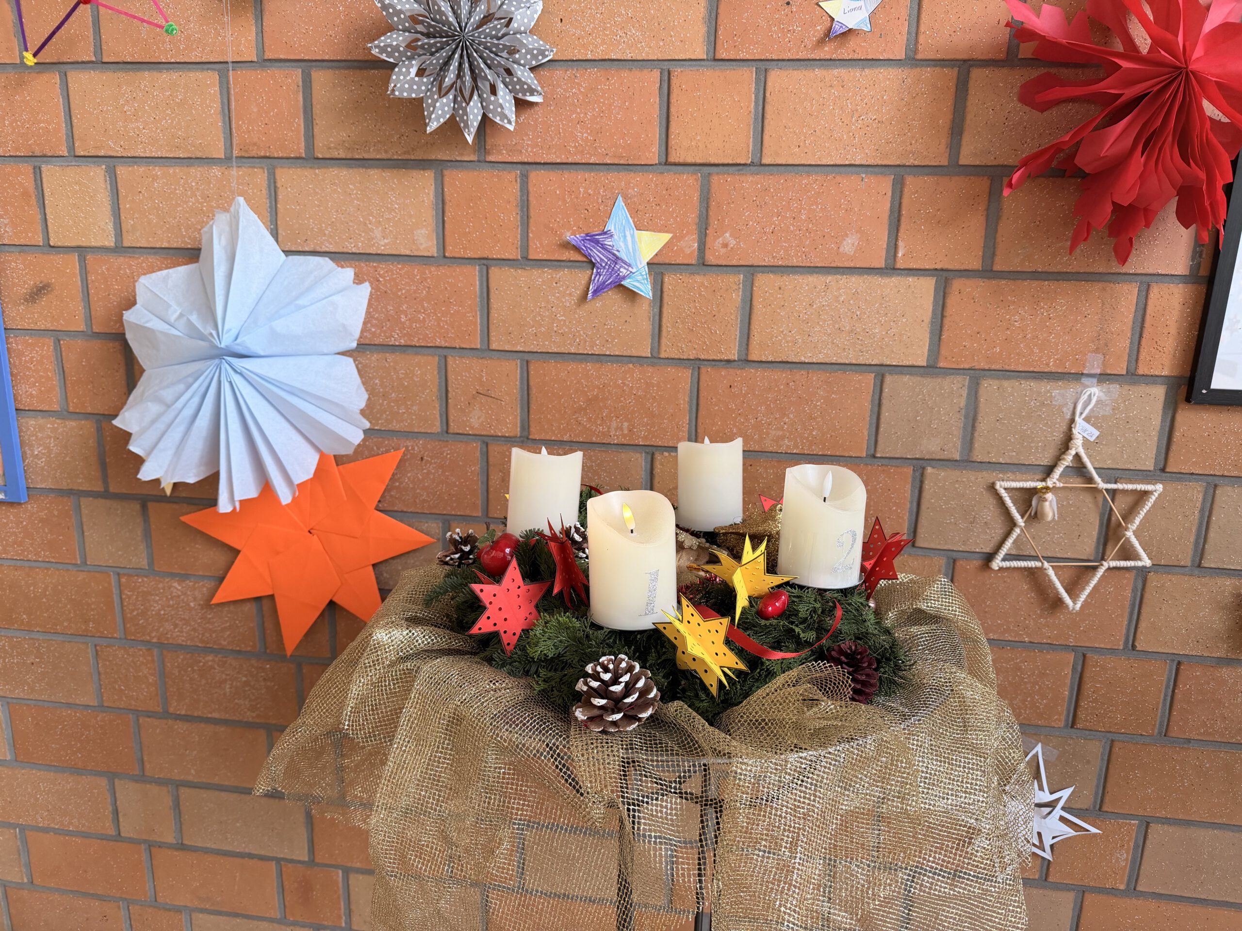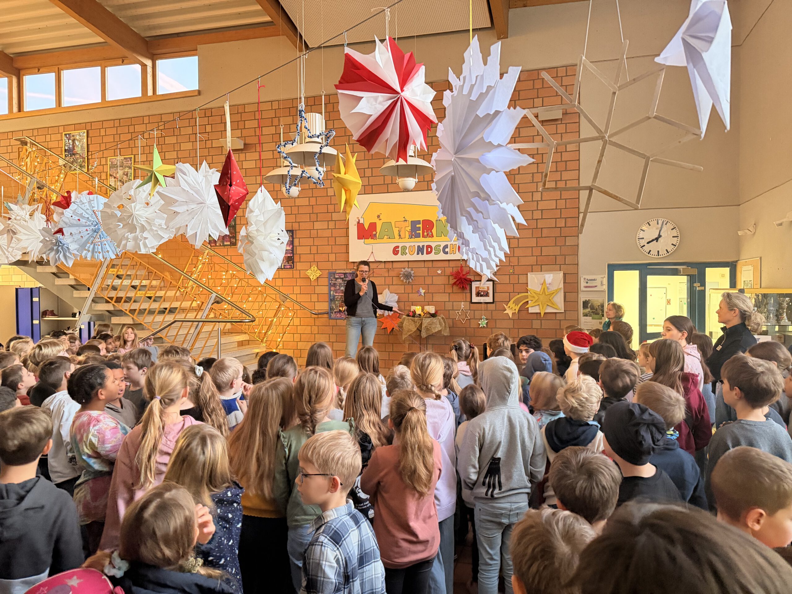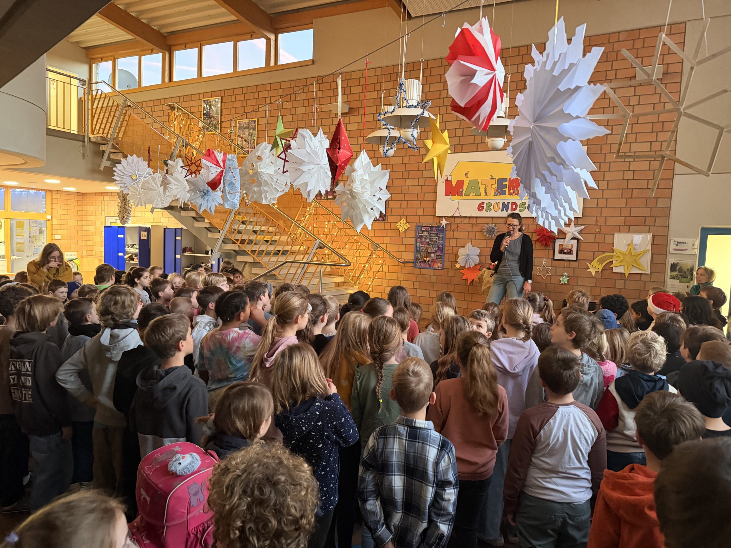Am ersten Montag im Advent versammelten sich alle Kinder unserer Schule im festlich geschmückten Foyer, das mit liebevoll selbstgebastelten Sternen erstrahlte. Gemeinsam sangen wir Advents- und Weihnachtslieder und stimmten uns so auf die besinnliche Zeit ein.
